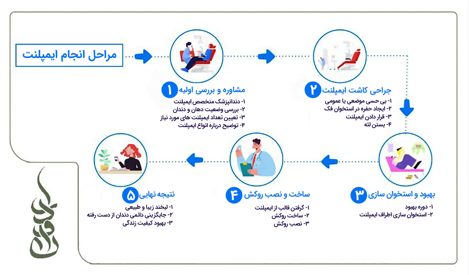در عکس رو به رو مرحلهبهمرحله با فرایند انجام ایمپلنت دندان آشنا میشویم.